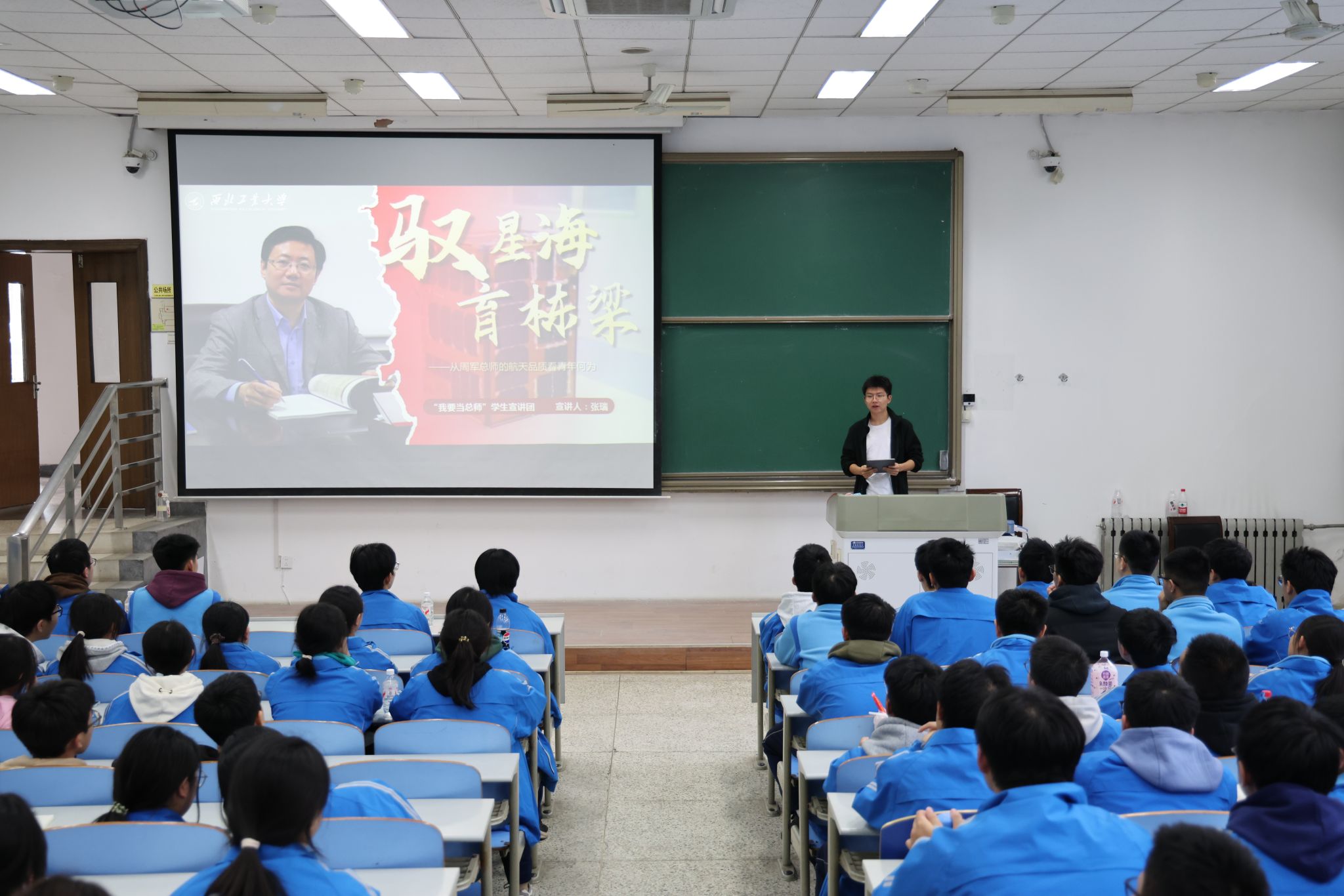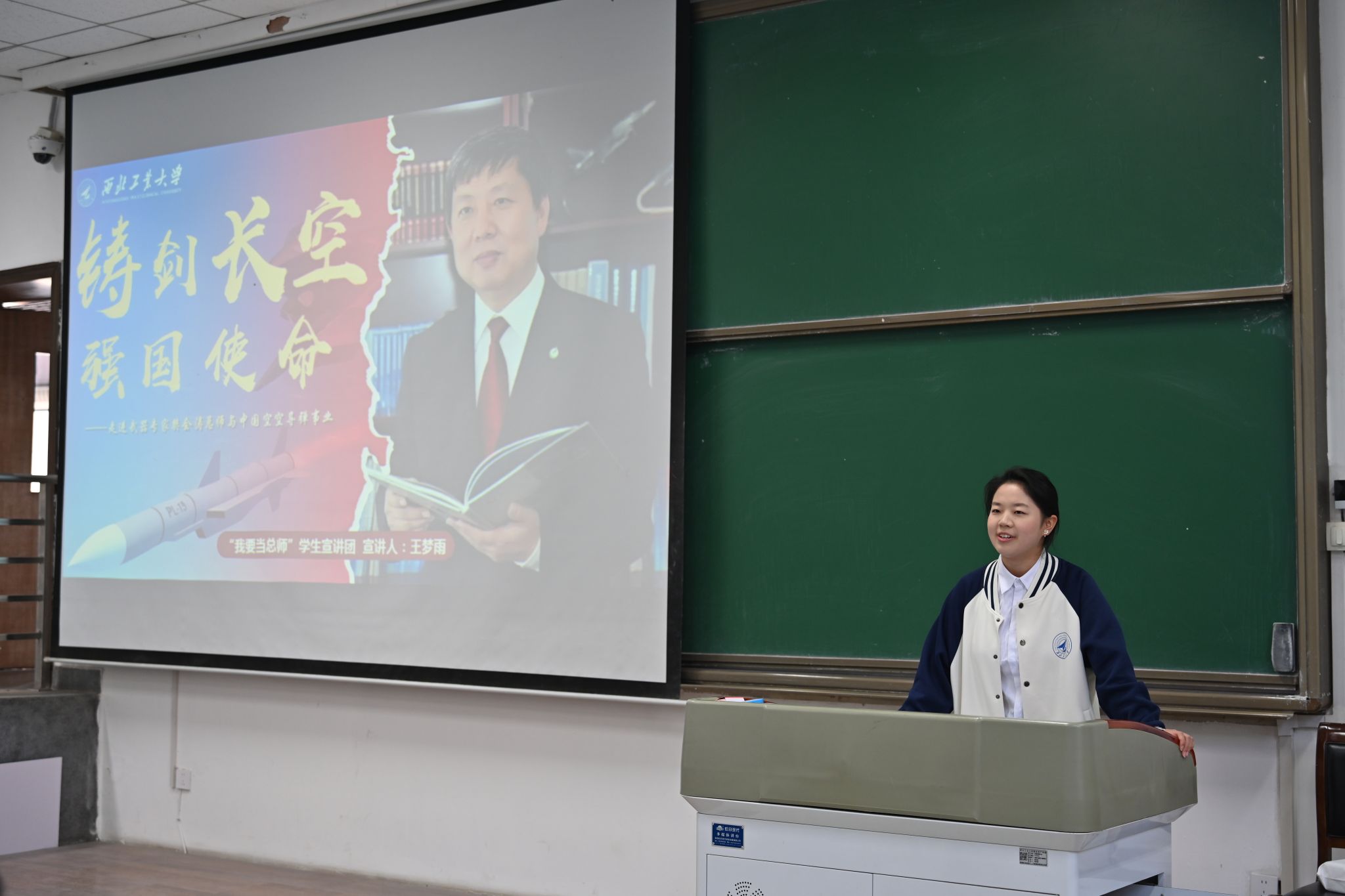 宣讲团成员王梦雨、张瑞分别聚焦我国空空导弹、“澳门科学一号”卫星B星总设计师,深情讲述了科研工作者们的爱国热忱与拼搏征程。王梦雨以“铸剑长空征程”为脉络,生动勾勒出怀揣航空梦想的少年成长为共和国空空导弹事业领军人物的奋斗轨迹,既让同学们清晰见证我国空空导弹技术从“仿制起步”到“自主创新跨越”的飞跃式发展,更被科研团队“精益求精攻难关、集思广益铸利刃”的拼搏精神深深感召。张瑞以“星海逐梦的坚守”为主题,通过攻克微小卫星技术难关的鲜活细节、饱含家国情怀的奋斗篇章,让同学们既深刻体悟“澳门科学一号”卫星B星从构思设计到成功发射的艰辛与荣耀,更真切感受科研工作者“扫清缺陷勇奋斗、星辰大海谱新篇”的责任担当与赤子情怀。