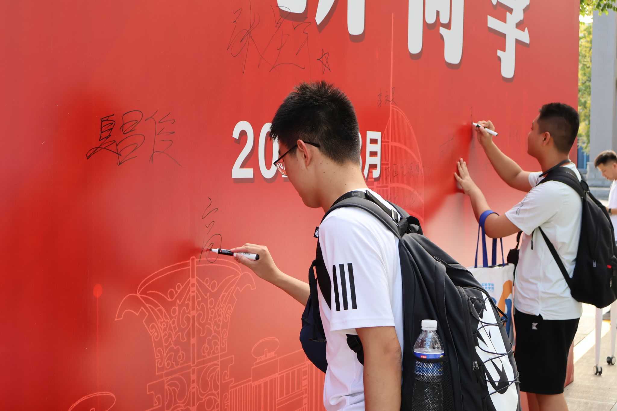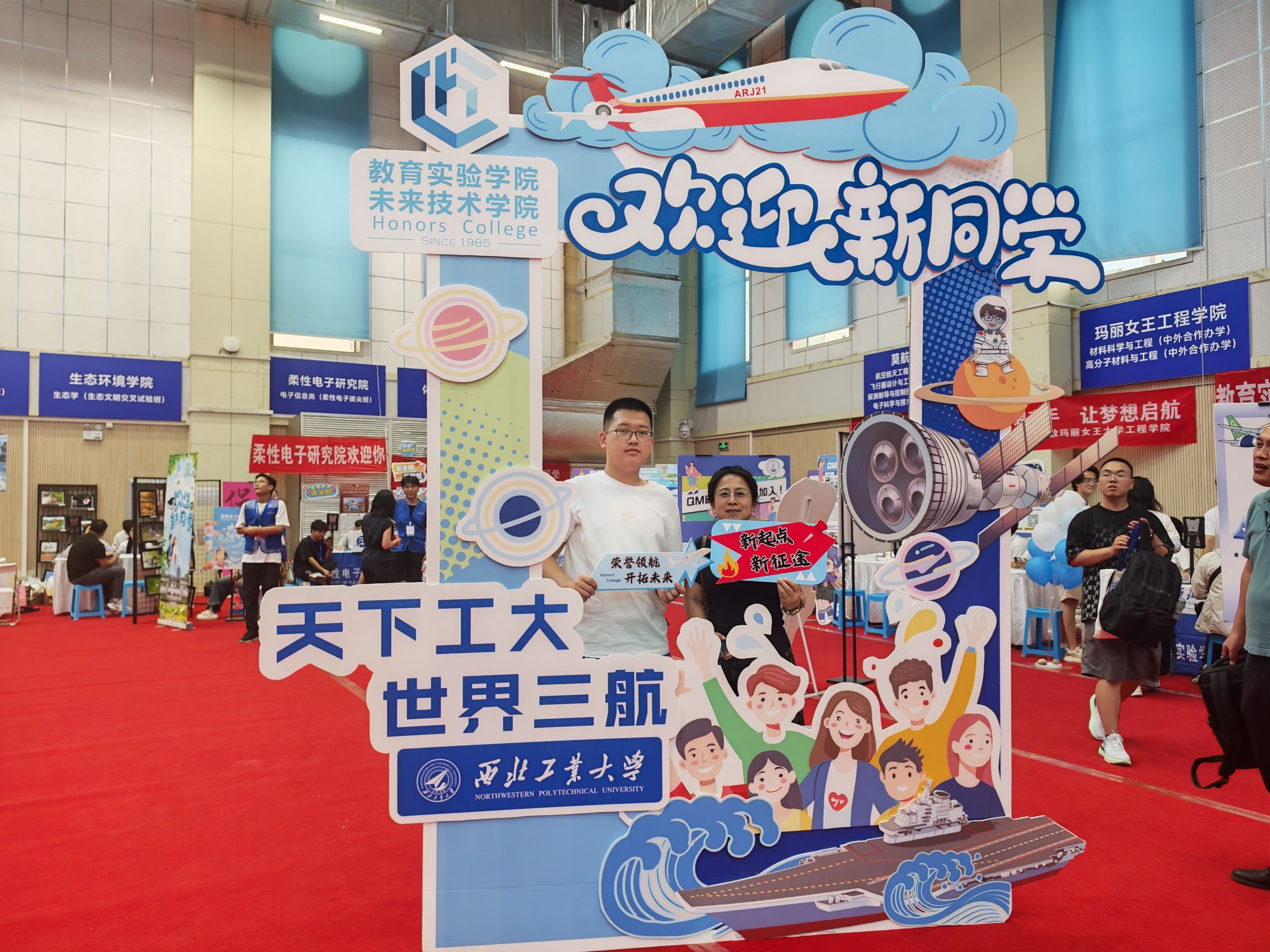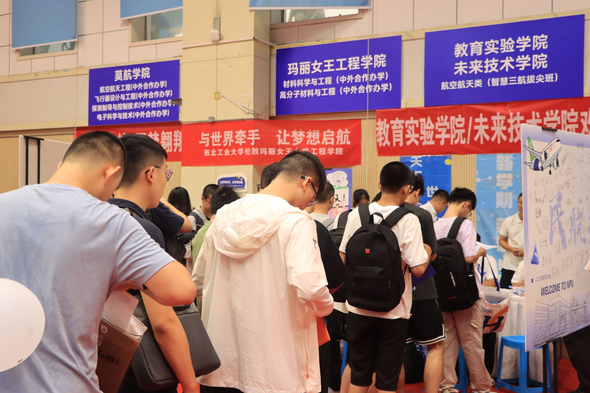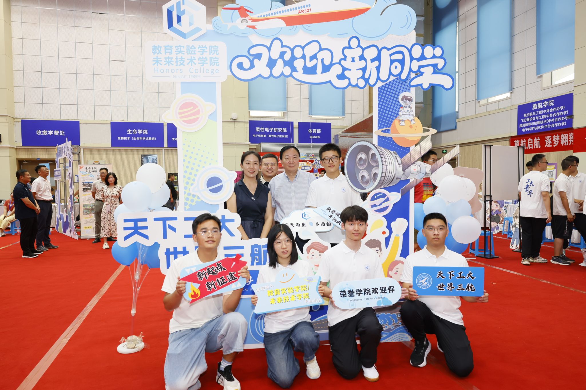 萌新们在家长的陪伴下开启了温馨的报到之旅:在体育馆内场提交档案,领取满载心意的新生礼包;移步外场,倾听志愿者的耐心讲解,了解校园概况、学院特色;来到学院报到处,新生们拿起马克笔郑重签下自己的名字,写下对大学生活的无限期许与美好愿望,并于特色合影板前定格与学院的第一张珍贵合影。