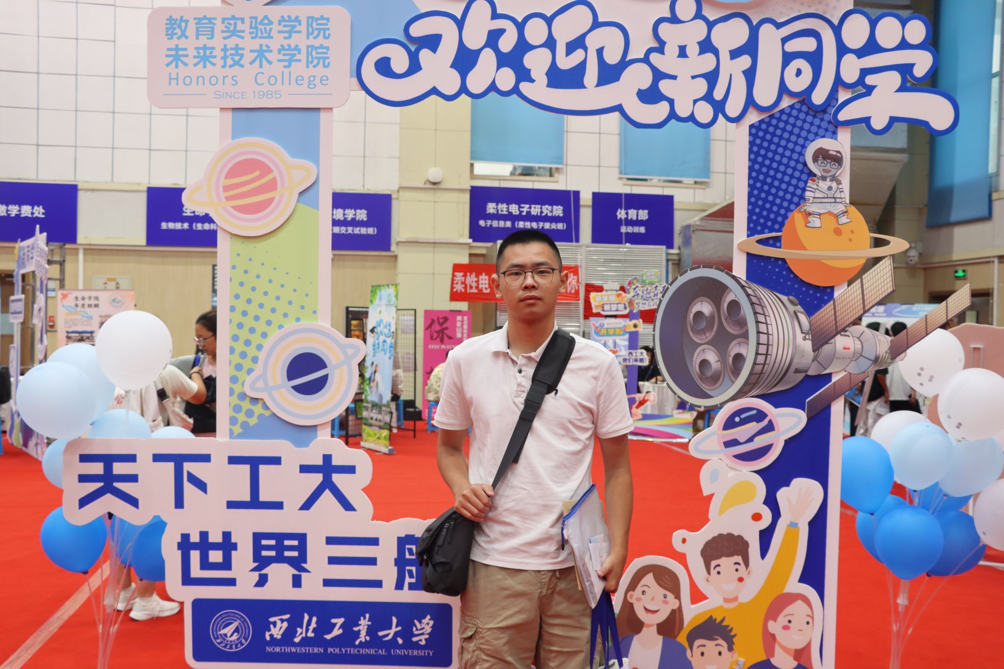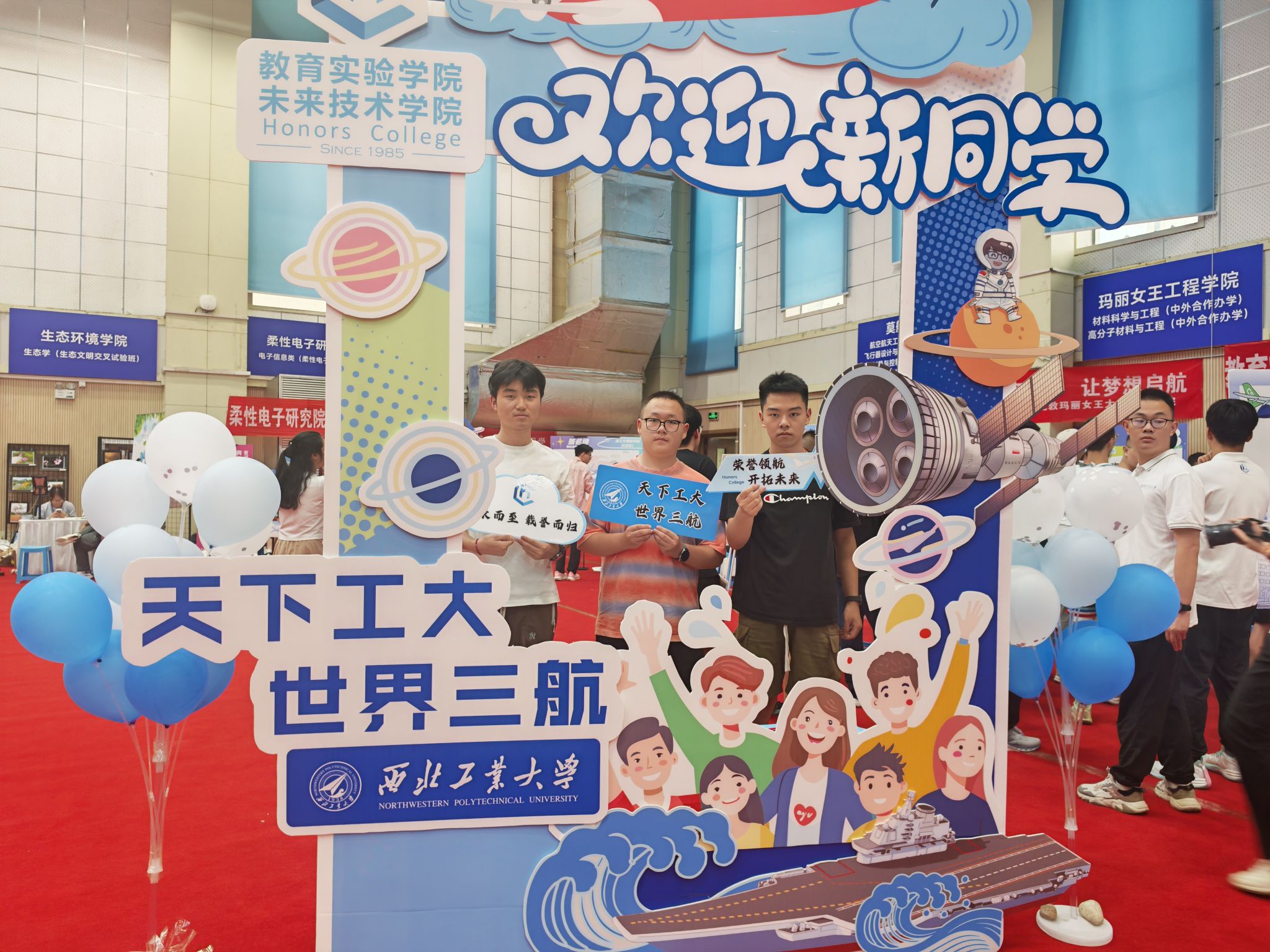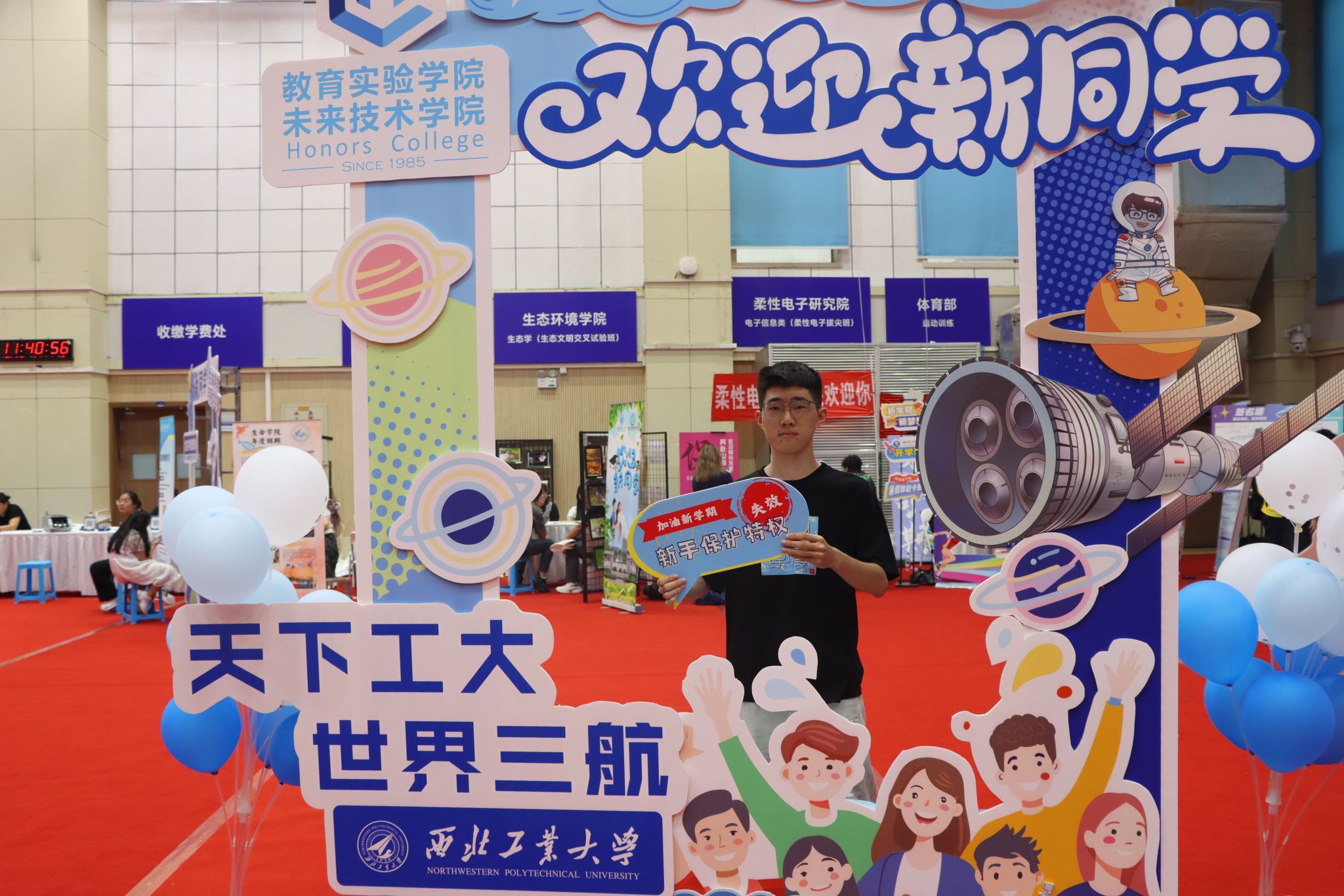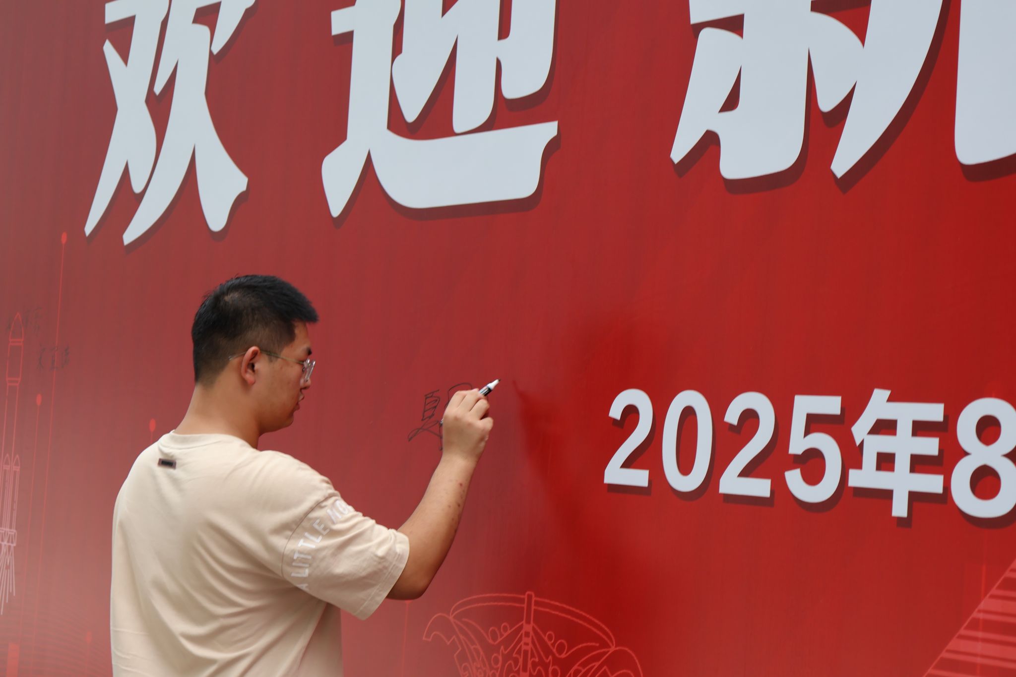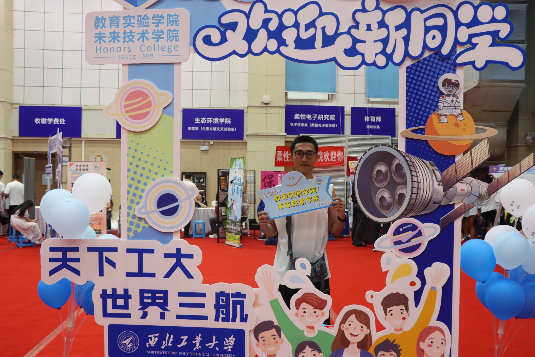 萌新们在家长的陪伴下开启了温馨的报到之旅:在体育馆内场提交档案,领取满载心意的新生礼包;移步外场,倾听志愿者的耐心讲解,了解校园概况、学院特色;来到学院报到处,新生们拿起马克笔郑重签下自己的名字,写下对大学生活的无限期许与美好愿望,并于特色合影板前定格与学院的第一张珍贵合影。