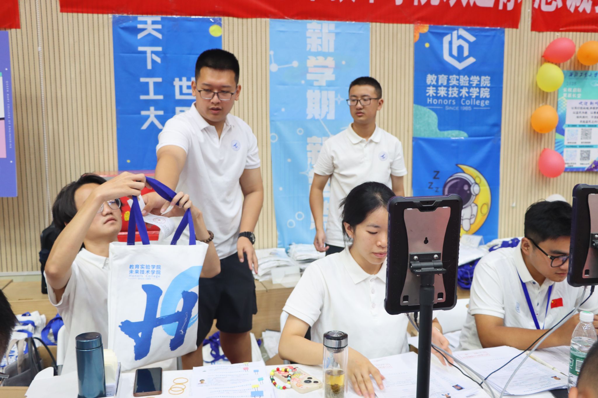 学生会的同学们热情似火,提前两日便投入到场地布置工作,各处装饰精心打磨,报到当天反复核查场地细节,清点承载着学院关怀的新生礼包,以满格热忱静候新同学的到来。